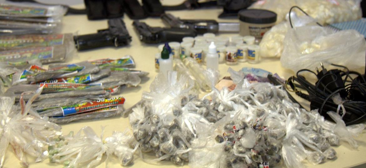 Armas e drogas encontradas em ação policial no completo da Maré - imagem: J. Parraguez/Agência O Dia