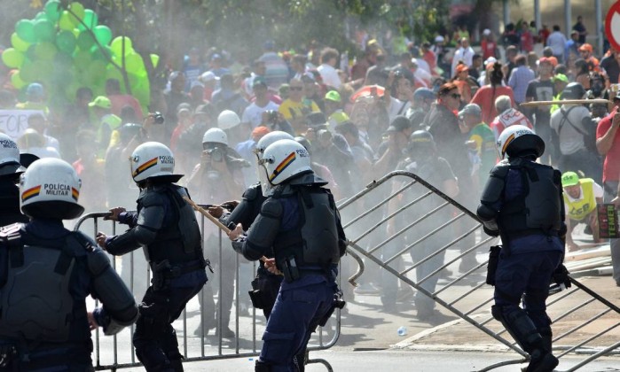 Protesto começou no início da tarde. Quando os manifestantes, alguns com o rosto coberto, chegaram próximos à grade que foi colocada para isolar a área do Congresso, do Palácio do Planalto e do Supremo Tribunal Federal, a polícia usou bombas de efeito moralFoto: Jorge William / Agência